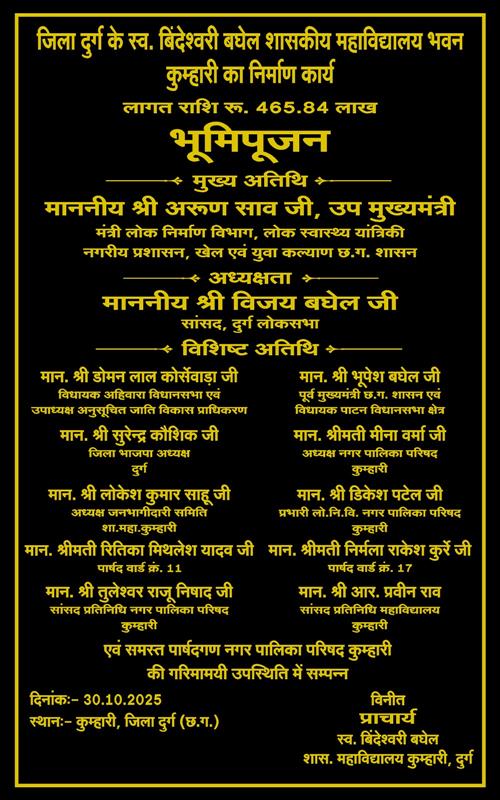 स्व. बिंदेश्वरी बघेल शासकीय महाविद्यालय, कुम्हारी के भवन निर्माण कार्य का भूमिपूजन कार्यक्रम 30.10.25